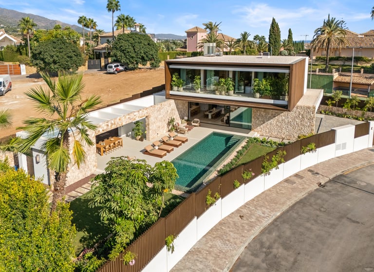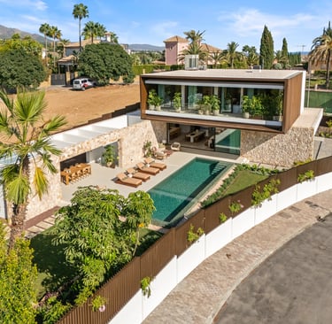 Casa Cazorla is a contemporary residence in Lomas de Marbella Club on the Golden Mile, combining architectural clarity with a strong connection to natural materials and outdoor living.