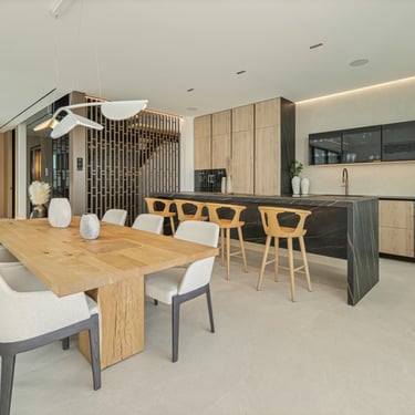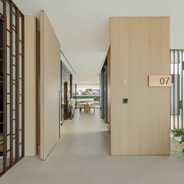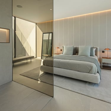 Upstairs, the bedroom suites are designed with understated elegance. The principal suite features sea views, private terrace access, and a refined bathroom with freestanding bath and integrated dressing area. Two additional guest suites follow a clean, modern design with natural materials and soft tones.