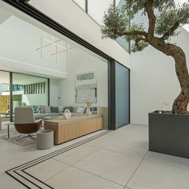 The entrance opens into a striking double-height living area centered around an interior courtyard with a mature olive tree — a unique architectural feature that defines the home. The main level flows through an open-plan kitchen, dining, and lounge area, framed by floor-to-ceiling glass and extending seamlessly onto the terraces.
